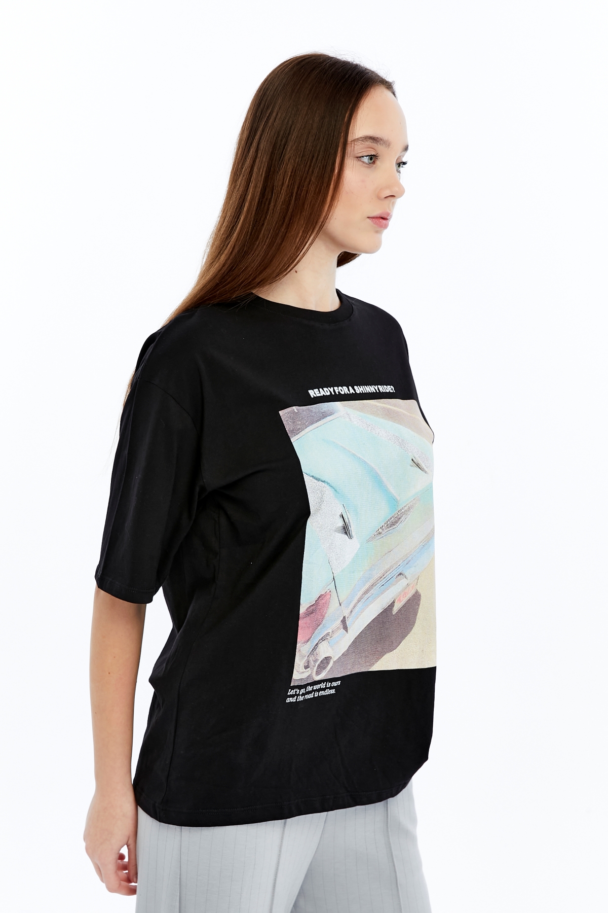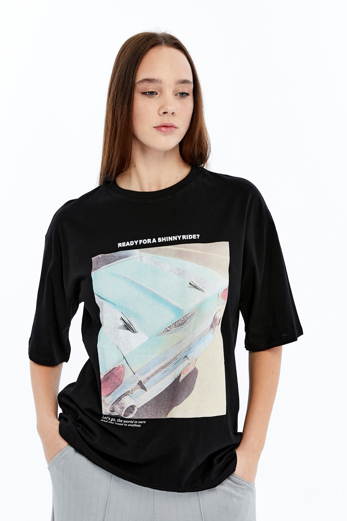 • Ürün Adı : 6789 (N-2440) Mavi Araba Baskılı  Kadın T-Shirt