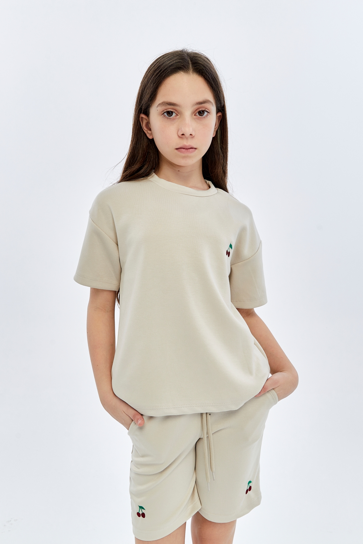26YEM7000021_15 9924-9975 Kirazlı Oysho 6/14 Yaş Cepli Kız Çocuk Şort Takım